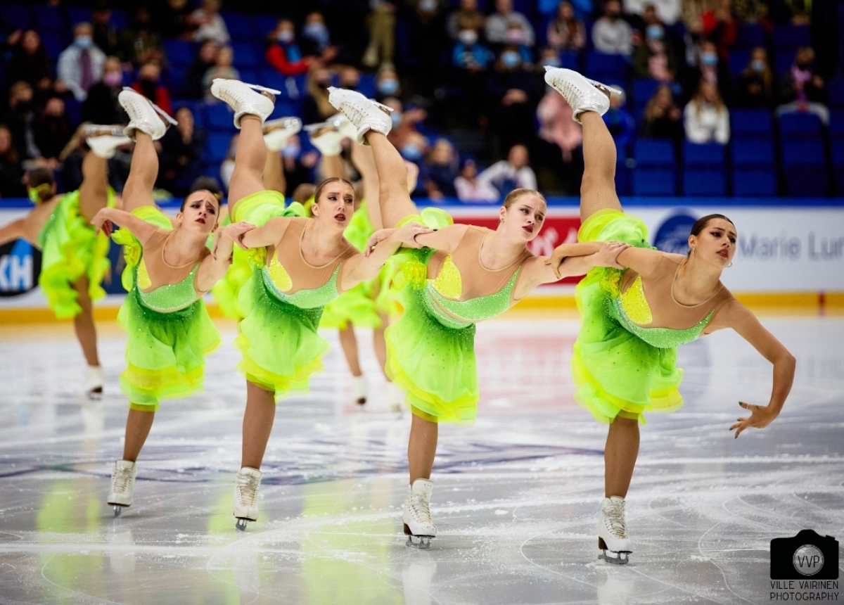 Adapted to the very feminine style of the team, the short program of the Helsinki Rockettes (FIN), "Femme Fatale", was presented for the first time. The performance convinced the jury who awarded the team 70.38 points and the second place. The skaters skated beautifully in red and black dresses and made no mistakes.