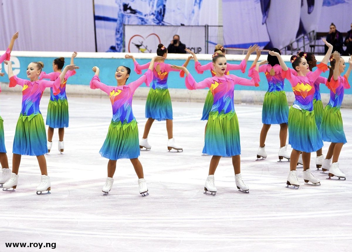 The Juvenile category had four participants from four countries. The gold medallist British Silhouettes (31.90 points) maintained confidence throughout the skate despite setback during warm up. They skated well to lively music. The first runner-up Le Soleil (25.45 points) from Poland attempted some difficult elements but they did not work fully to team’s favor and made some falls. Nevertheless, they stayed ahead of bronze medallist Team Illuminis (23.55 points) who skated to “Beauty and the Beast” music in a sharp yellow outfit. Belgian Minia (18.74 points) enjoyed much fanfare from spectators as they were crowned Belgian champion in Juvenile category.